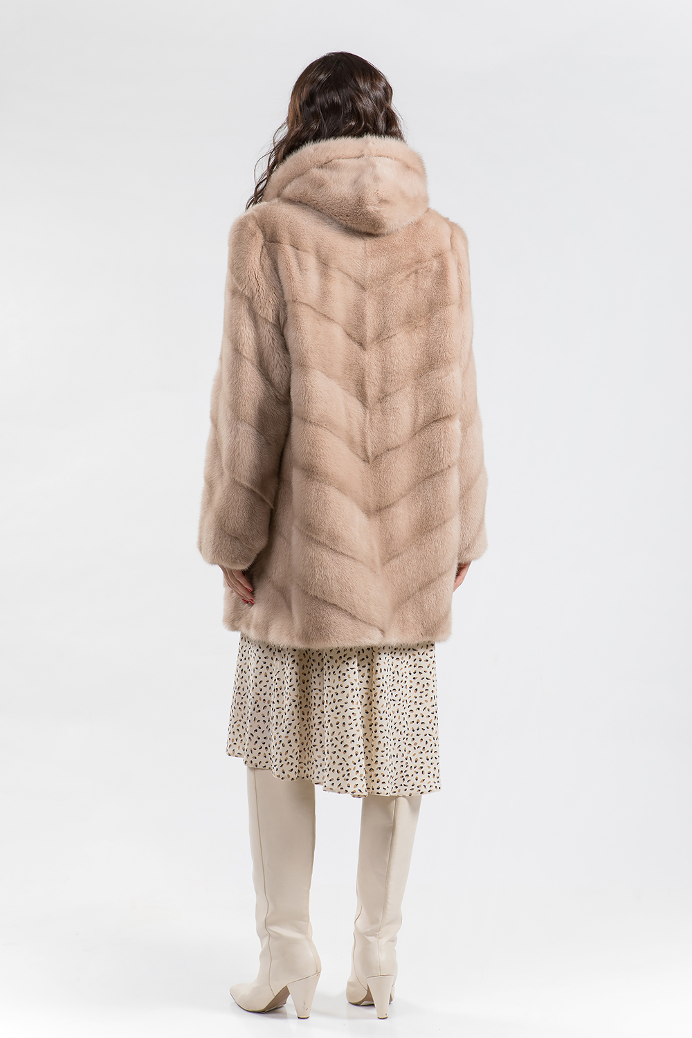 Норковая куртка с капюшоном, выполненная в технике диагональной выкладки пластин. По низу и на талии предусмотрены регулируемые утяжки. Длина изделия составляет 88 см. Куртка отличается легкостью и удобством, не стесняет движений и обеспечивает хорошую вентиляцию, что делает ее идеальным выбором для вождения автомобиля.