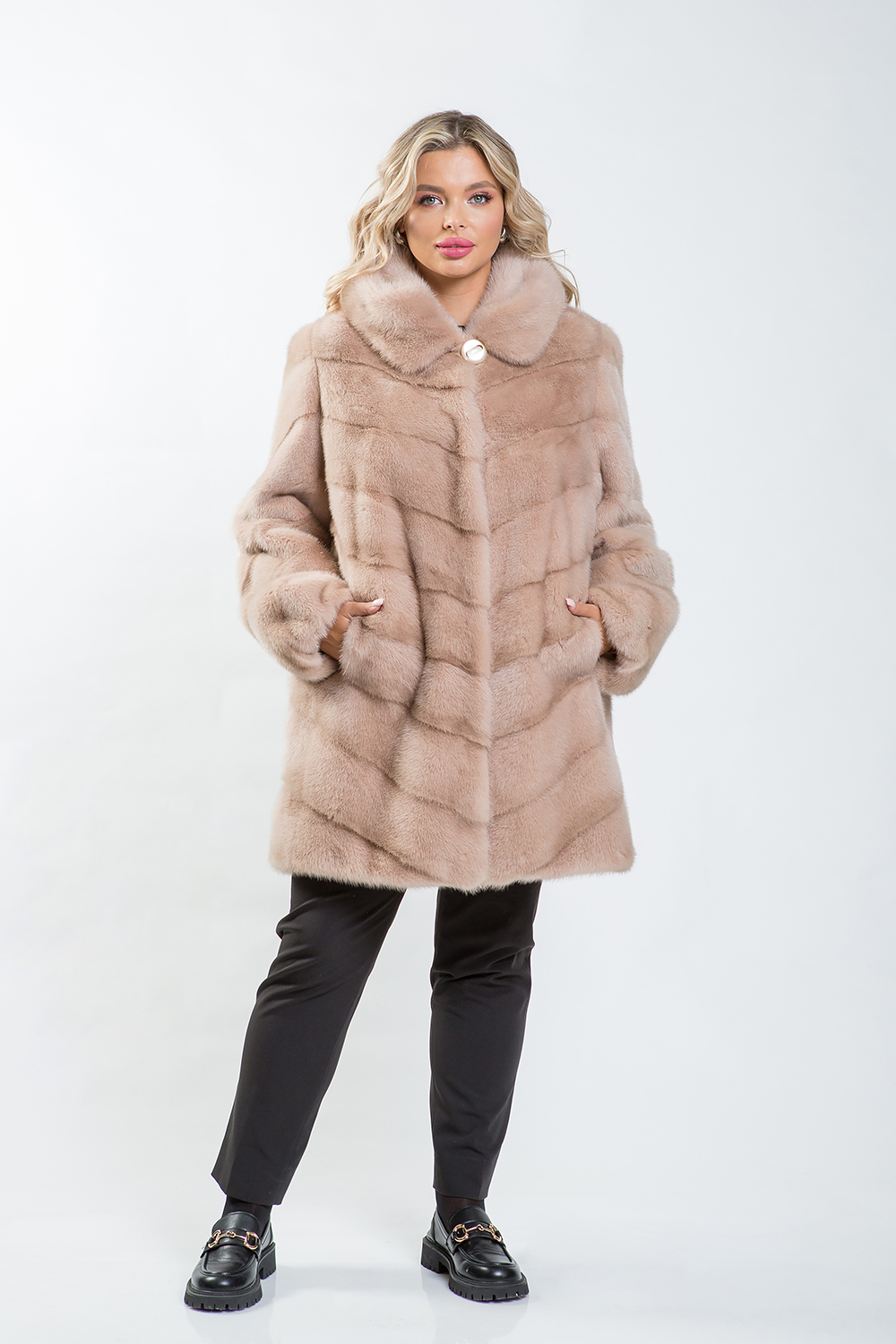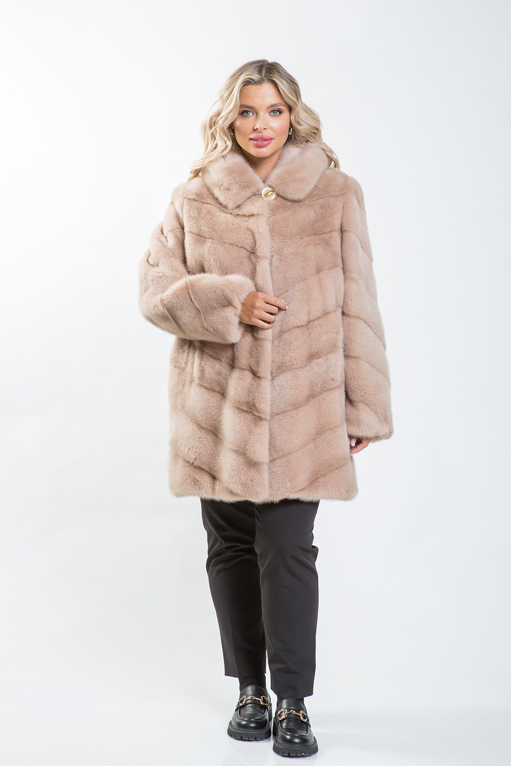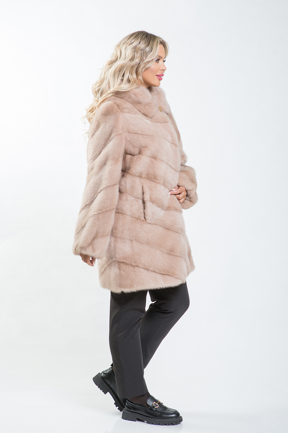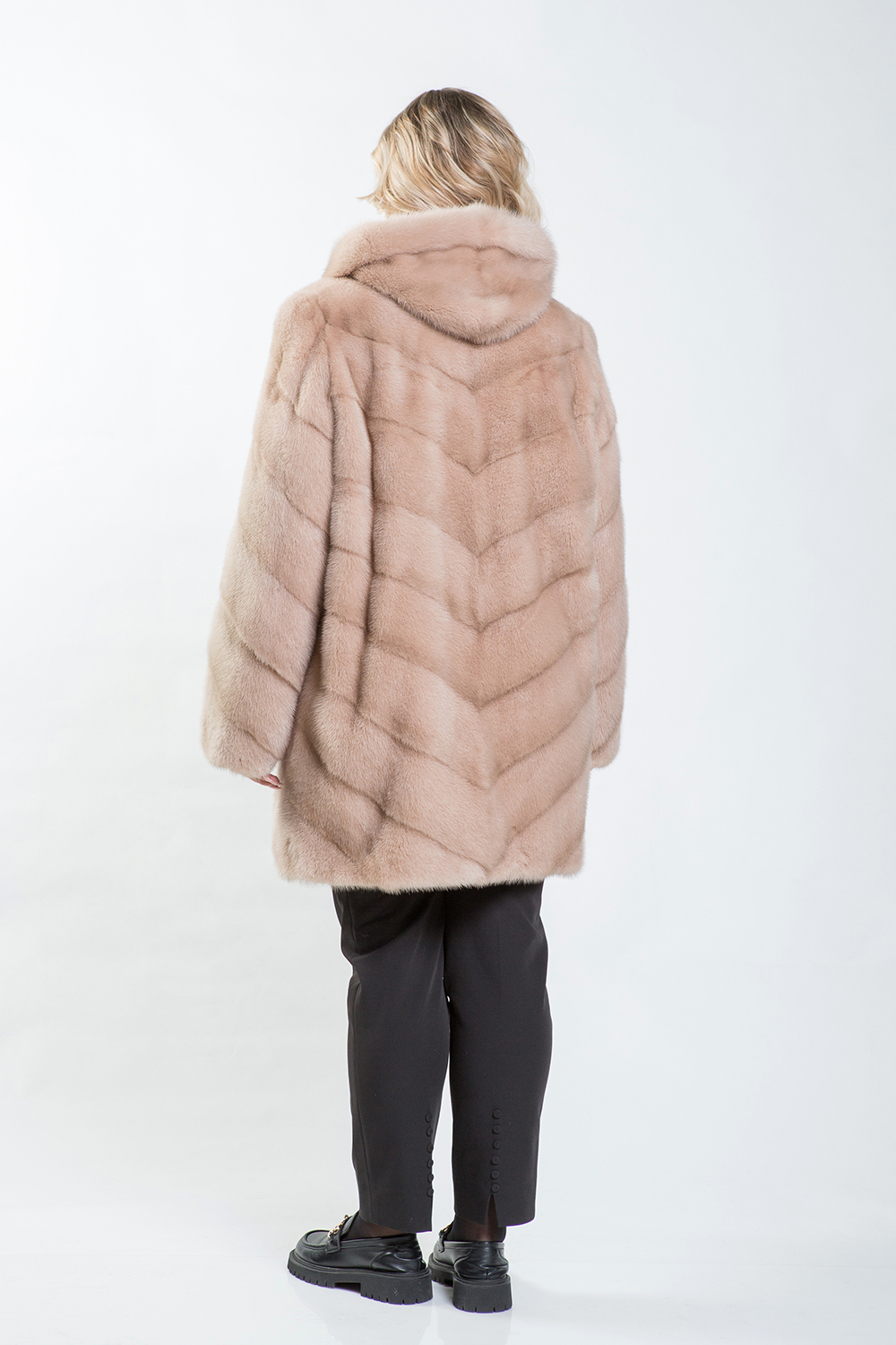 Эта куртка изготовлена из натурального меха норки и дополнена капюшоном. Её крой представляет собой диагональную выкладку пластин, что делает её невероятно стильной и элегантной. По низу и на талии предусмотрены регулирующие утяжки, позволяющие подогнать куртку по фигуре. Длина модели составляет 88 см.