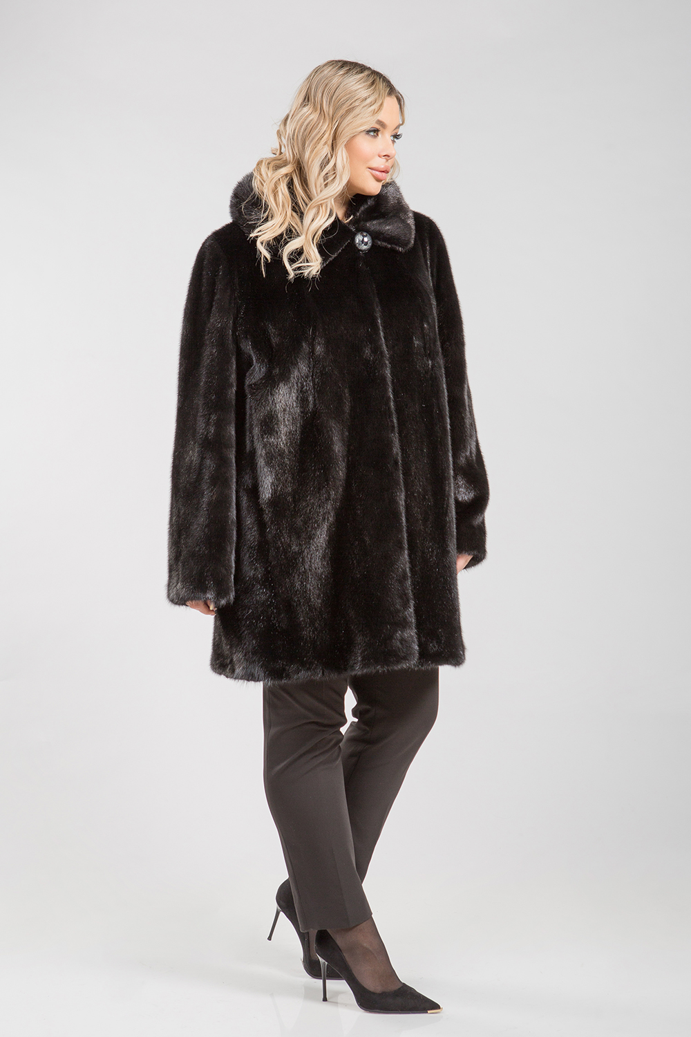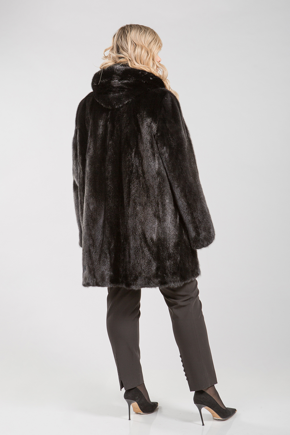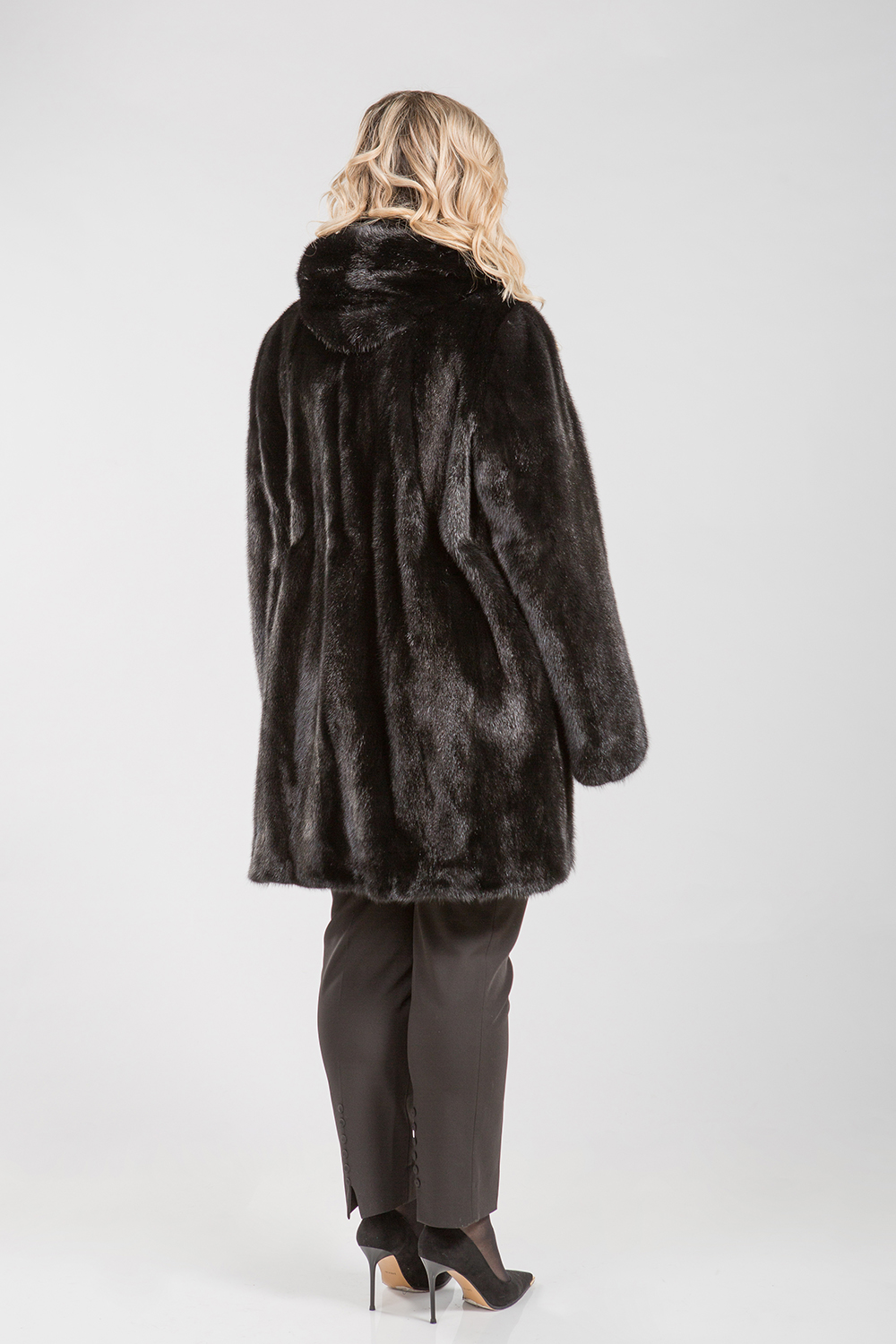 Удлинённая куртка из норки с капюшоном. Крой — роспуск. Модель оснащена регулирующими утяжками на рукавах, по низу изделия и в зоне талии. Длина куртки — 90 см.