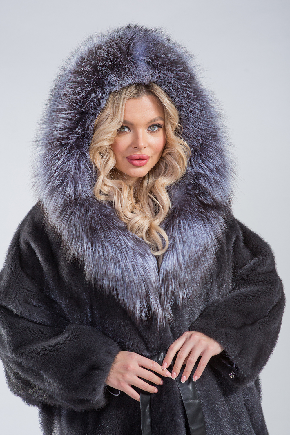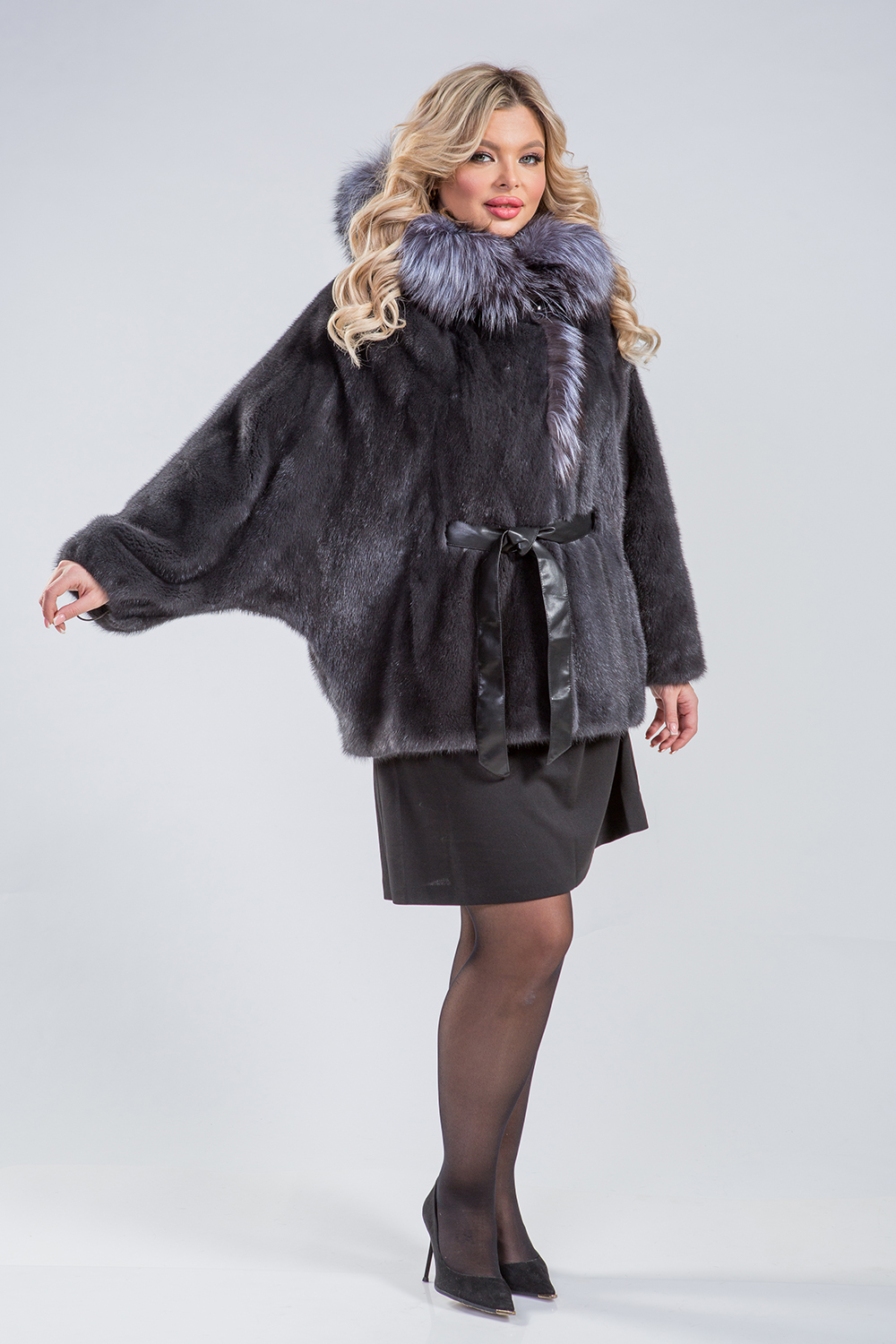 Курточка-пончо из меха норки. Капюшон модели декорирован мехом чернобурой лисы. Крой изделия роспуск. Рукава и низ курточки оснащены регулирующими утяжками. Длина изделия 75 см. Кожаный пояс шубки продевается внутри изделия и тем самым придает курточке оригинальность. А благодаря шикарной лисе шубка выглядит очень эффектно, добавляя в образ модели нотки шика и гламура!