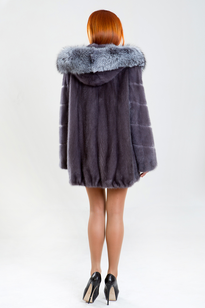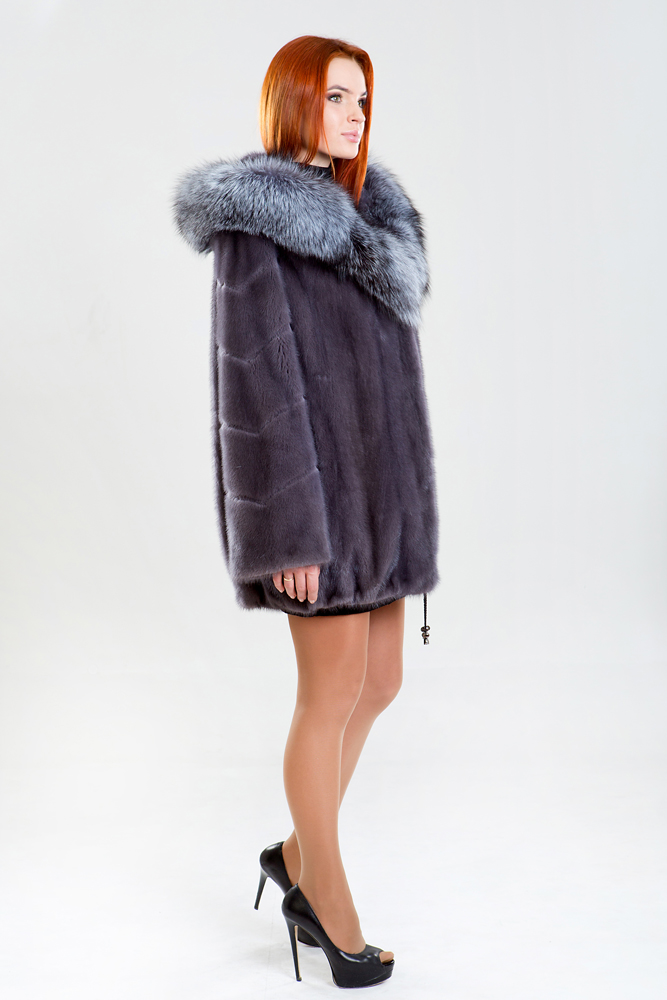 Куртка из норкового меха, украшенная роскошным капюшоном из чернобурой лисы. Модель выполнена в классическом прямом силуэте, а по низу изделия предусмотрена регулирующая утяжка. Рукав представляет собой диагональную выкладку пластин с декоративной выстрижкой меха. Длина изделия составляет 80 см.