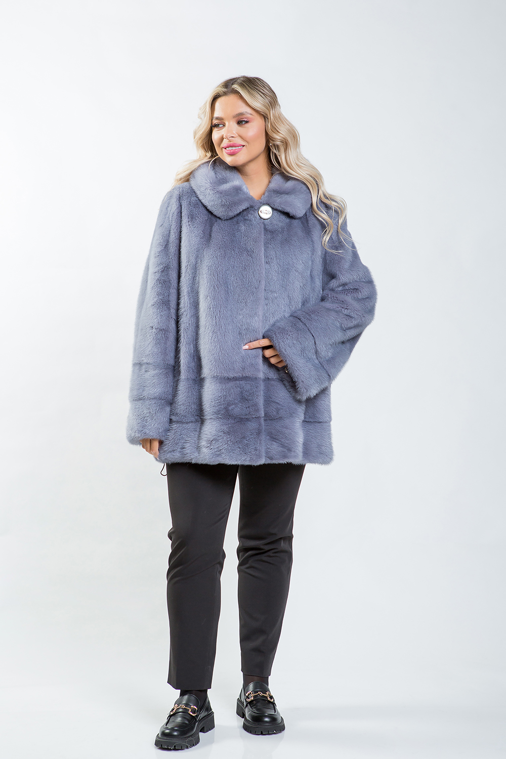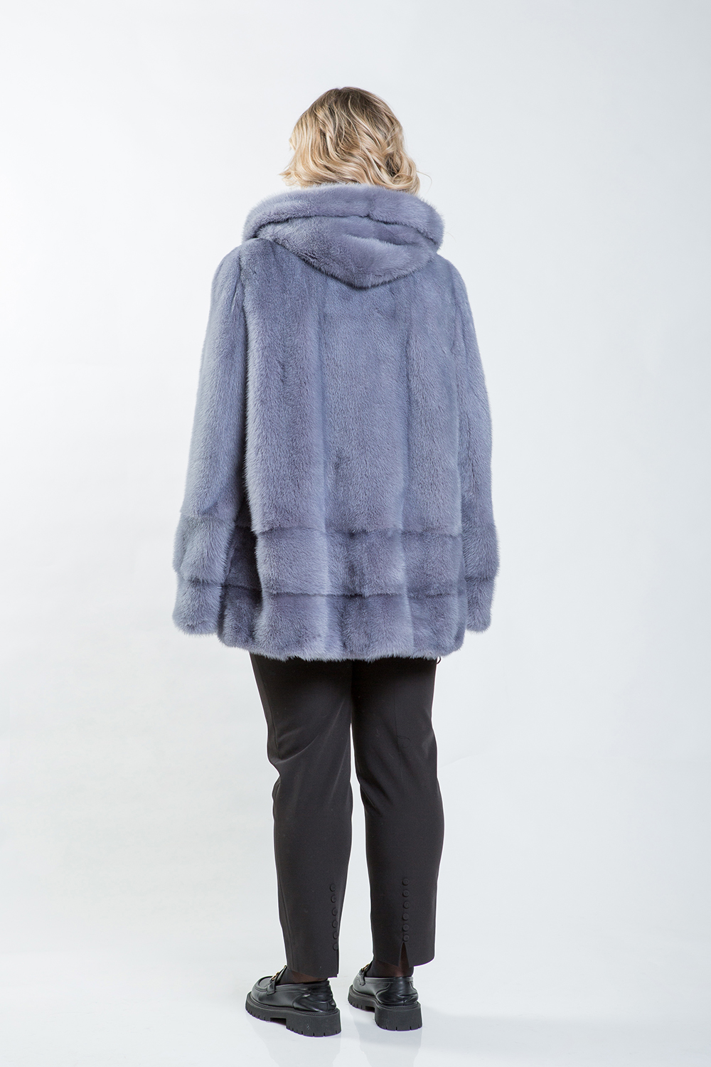 Курточка из меха норки с капюшоном. Крой изделия комбинированный. Верх модели сшит в роспуск, а низ поперечная выкладка пластин. На талии, на рукавах и по низу модели имеются регулирующие утяжки. Длина изделия 80 см. Рукава модели трансформируются в более короткие, с помощью потайных молний. Укороченная длина изделия обеспечивает повышенный комфорт при носке, что особенно важно для автоледи. Нежно-голубой оттенок шубки освежает и омолаживает образ!