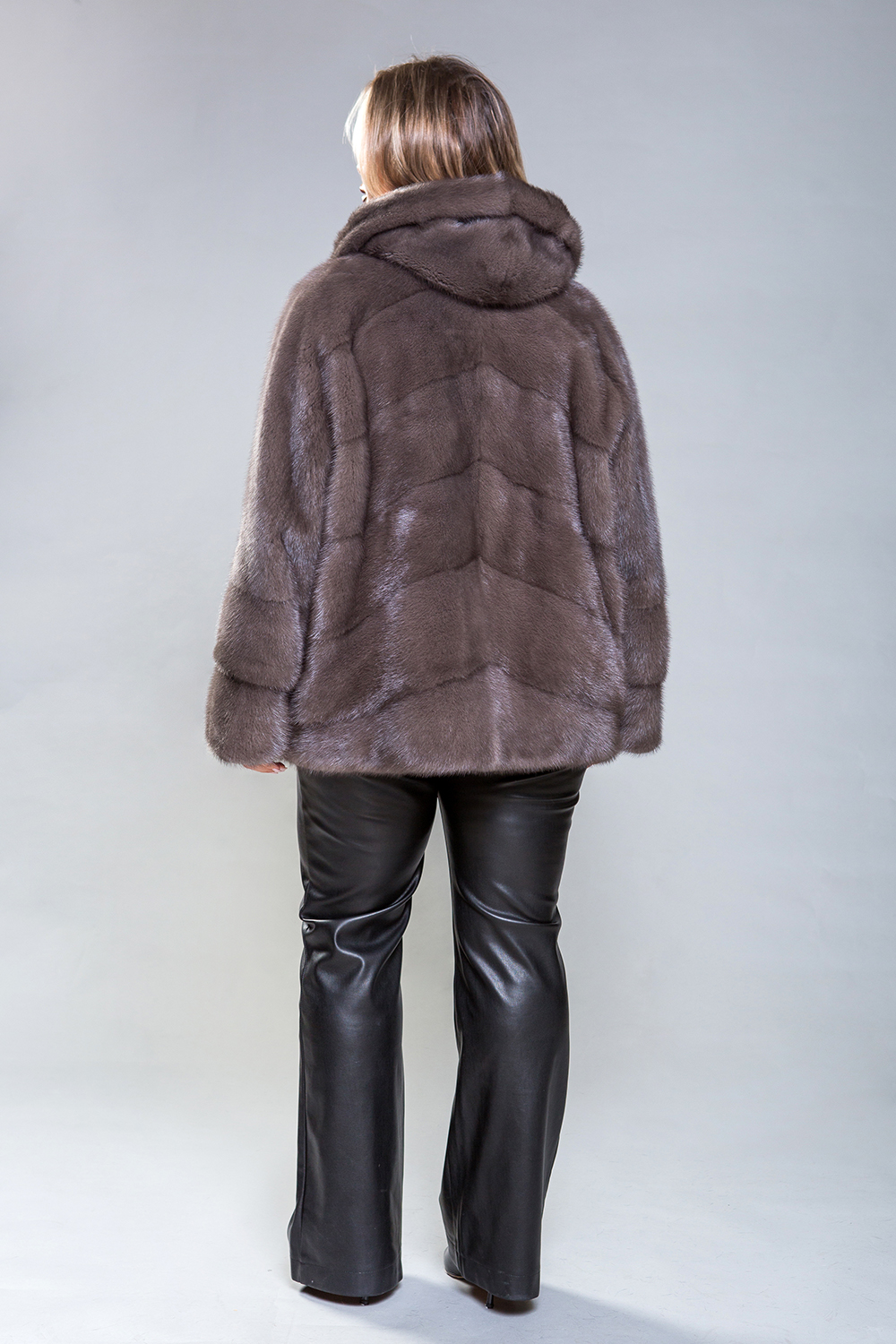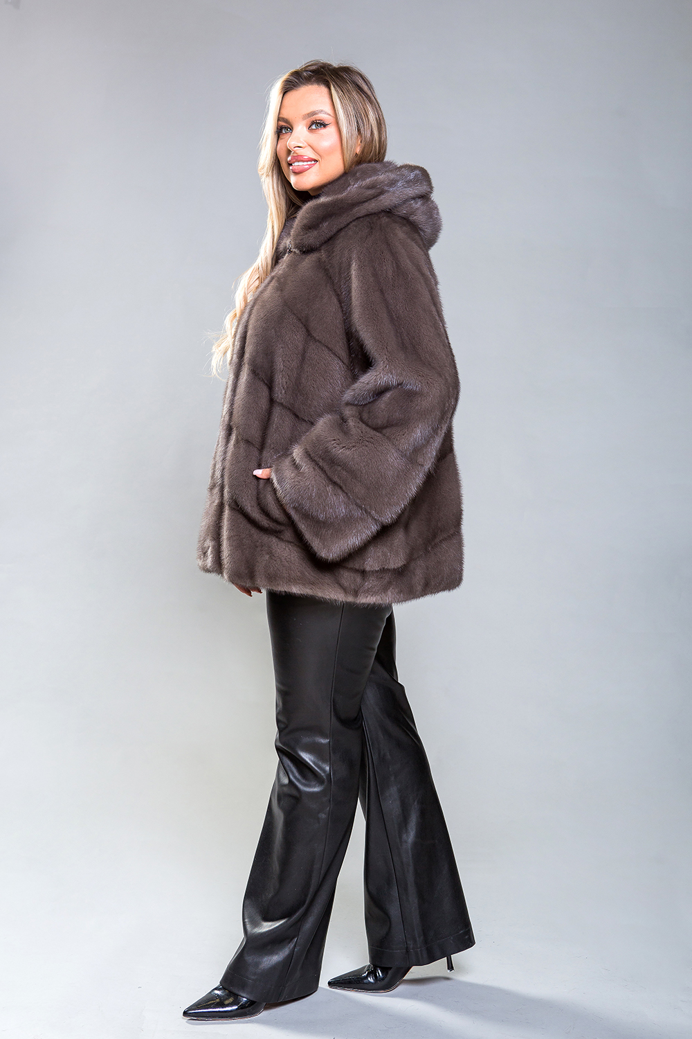 Норковая куртка с капюшоном. Модель выполнена в технике диагональной выкладки пластин. Изделие регулируется утяжками на талии, рукавах и внизу. Длина куртки — 70 см. Она отлично сочетается с брюками любого кроя и юбками любой длины. Эта куртка универсальна, комфортна и уютна.