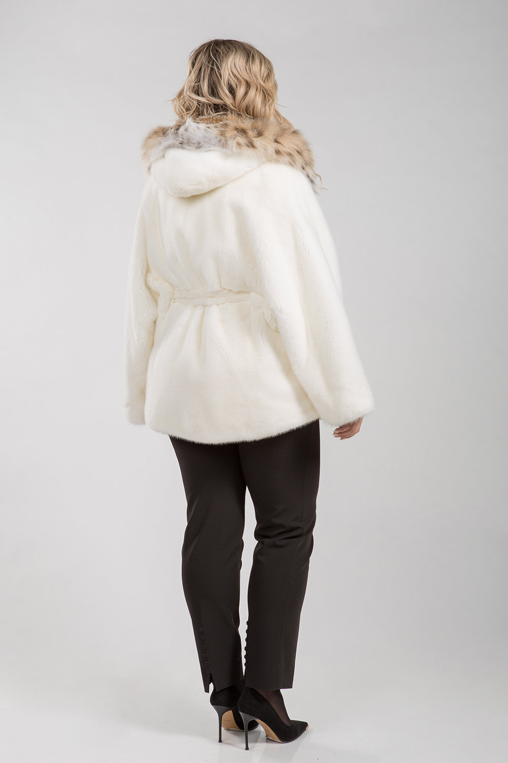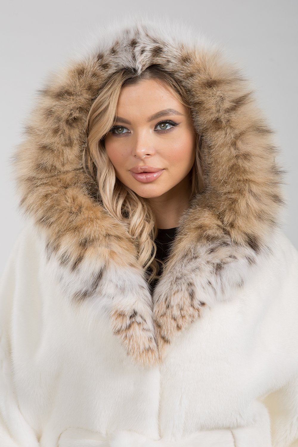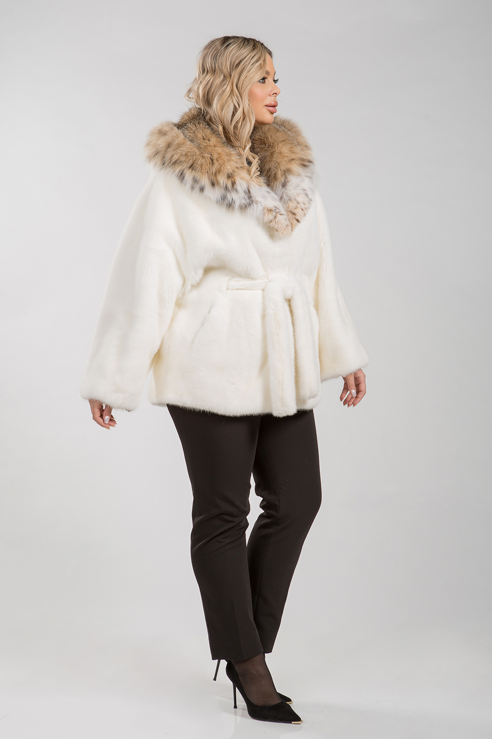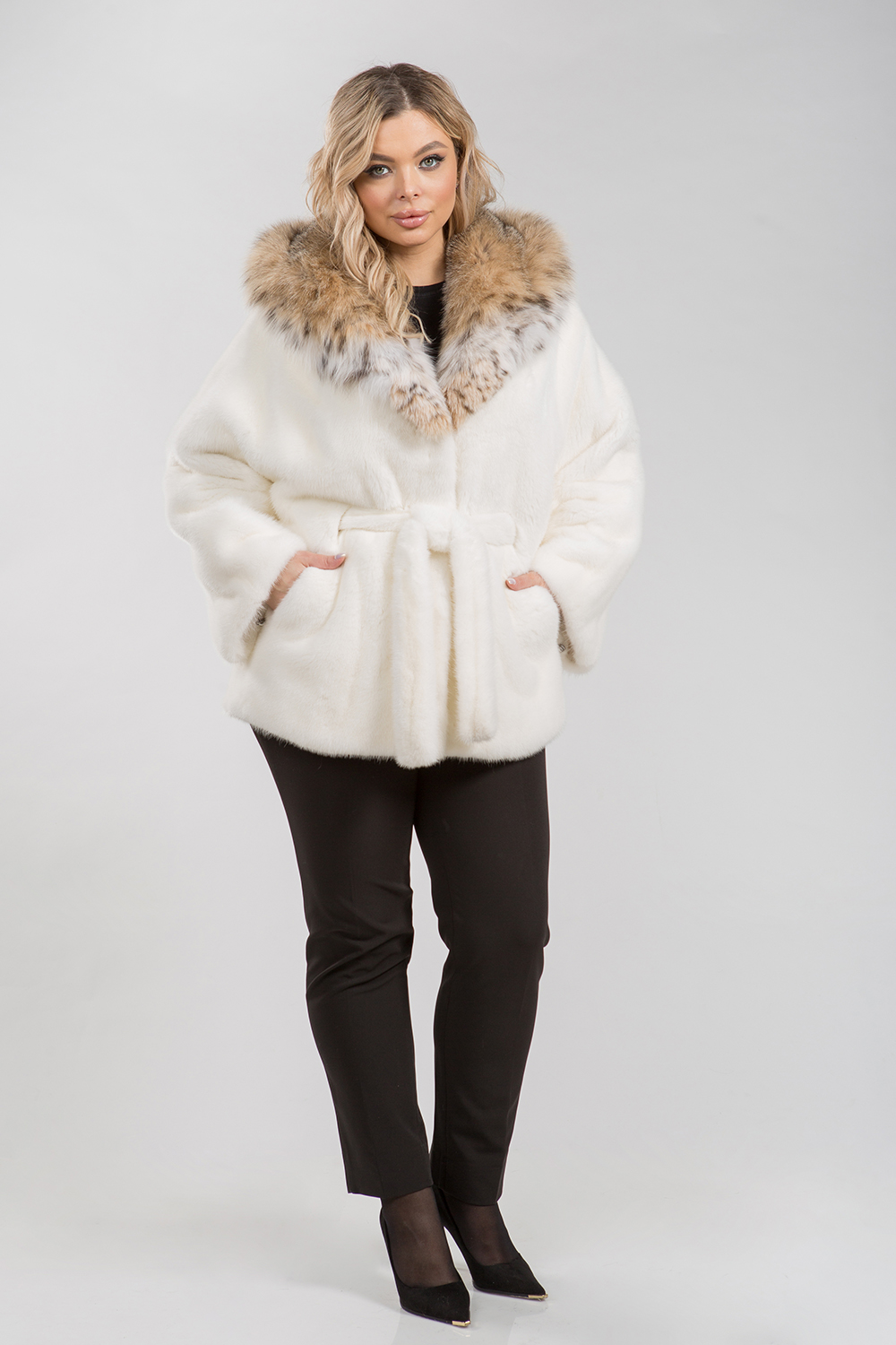 Курточка из меха норки. Капюшон модели декорирован мехом рыси. Крой изделия роспуск с добавлением пластин. На рукавах и по низу модели есть регулирующие утяжки. Длина изделия 77 см. Меховой пояс шубки продевается внутри изделия и тем самым придает курточке оригинальность. А благодаря шикарной рыси шубка выглядит очень эффектно, добавляя в образ модели нотки шика и гламура!